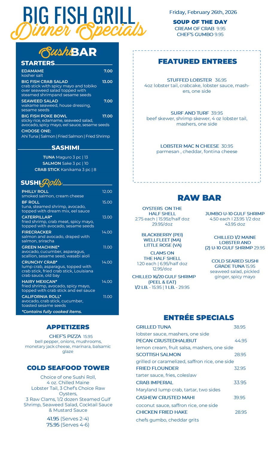4pm-9:30pmDINNER SPECIALSFriday, February 27th, 2026
