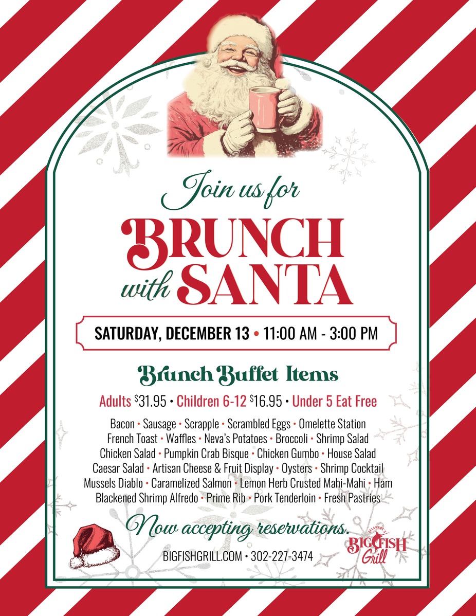 Celebrate the season with our Santa Brunch Buffet, featuring Big Fish favorites, a festive atmosphere, and a special visit from Santa. Now accepting reservations for any size party. Call 302-227-3474 to reserve. Adults $31.95 | Children 6-12 $16.95 | Kids Under 5 Eat Free